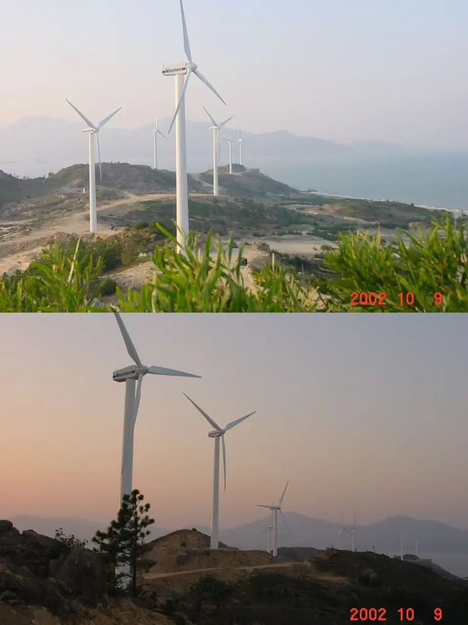 本组照片记录了泰胜风能首个项目 —— 汕尾红海湾风电场的变迁。该项目 2002 年 9 月并网,安装 25 台 Vestas V47-660kW 机组,是国华投资国内首个风电项目、广东早期重要示范工程。2022 年 9 月,运行 20 年的老旧机组退役,原址升级新建 5 台大容量机组。如今风车岛依旧是知名景点,风机换新,风光延续。五张照片于 2002 年 10 月 9 日在汕尾拍摄。