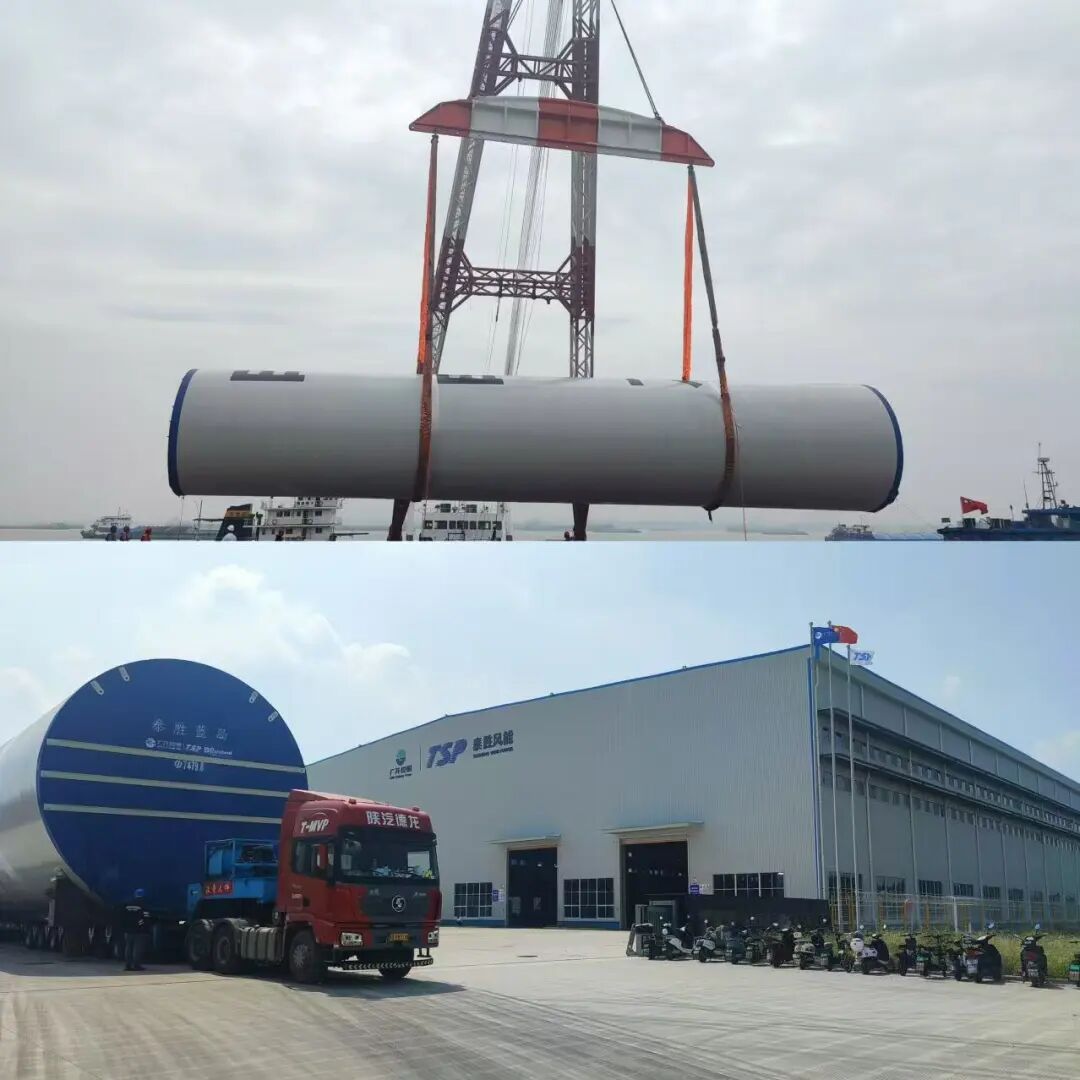 泰胜扬州基地是于2022年9月15日打入了第一根桩,2023年7月正式生产,2023年9月18日首套塔筒产品启运,9月19日完成首套产品装船。我和扬州基地一路走来,见证了泰胜扬州基地的很多第一次:从一片黄土到现代工厂的拔地而起;从第一张钢板进场到第一套产品的履约交付;从集团最年轻的工厂快速成长为单体年产量最大的塔筒工厂,泰胜扬州日新月异的成长,是泰胜风能蓬勃发展的一个重要注脚。