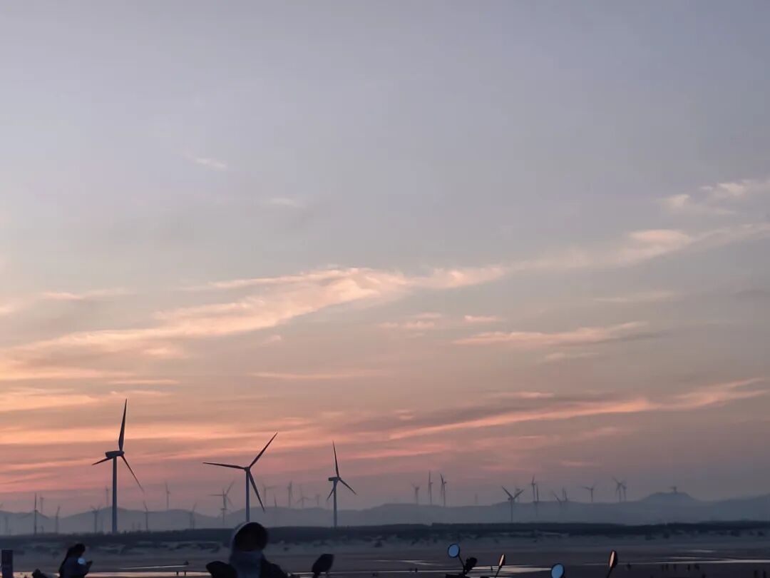 这是一张记录平潭岛长江澳风力田黄昏的纪实影像。画面中,成排的风车在暮色中勾勒出工业与自然共生的轮廓。