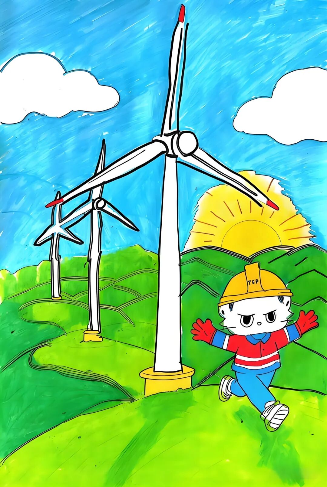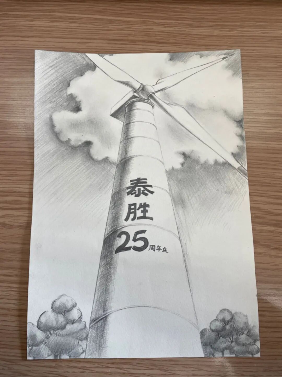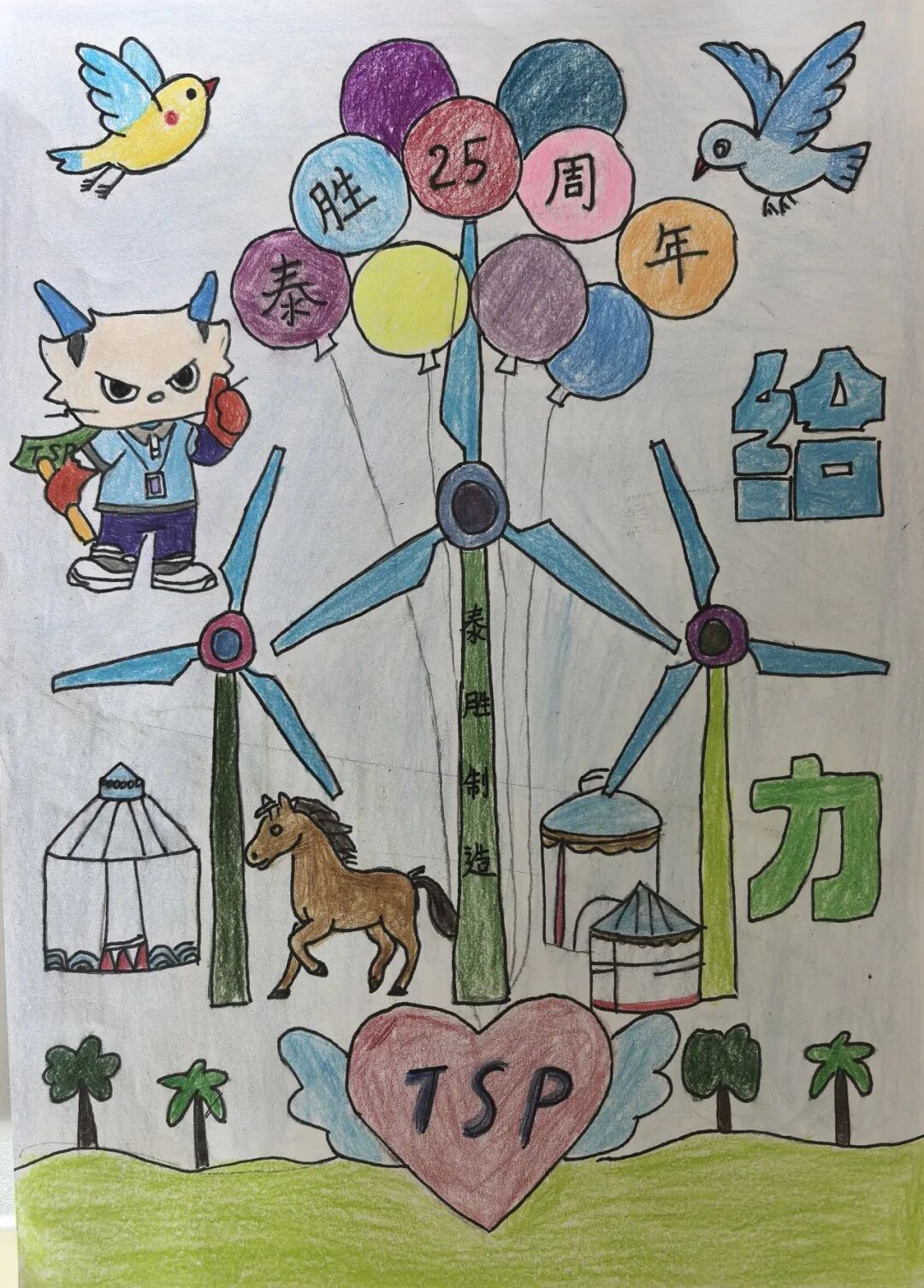 创意说明:这是一幅充满朝气与祝福的简笔画,核心主题为庆祝泰胜25周年,印有“泰胜制造”字样的蓝色风力发电塔筒,构成视觉主骨架;品牌与愿景:右侧醒目的“给力”字,直白传递出对泰胜实力的认可与未来发展的满满信心;展现出员工对企业未来“马力全开、再创佳绩”的殷切期盼。