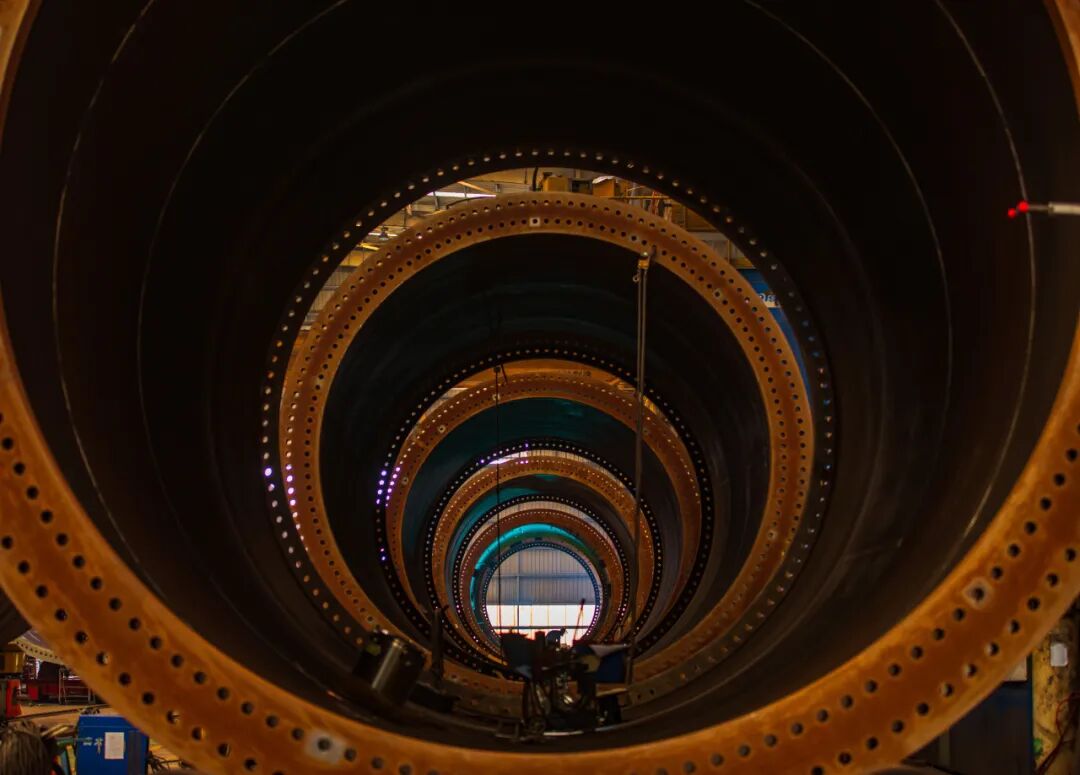 一段段黑塔,层层摆放的结构,就像年轮,泰胜风能25年的发展就像“时光年轮”,传递着向海图强,绿色赋能的产业精神,展现了可再生能源装备行业制造的工业美学。