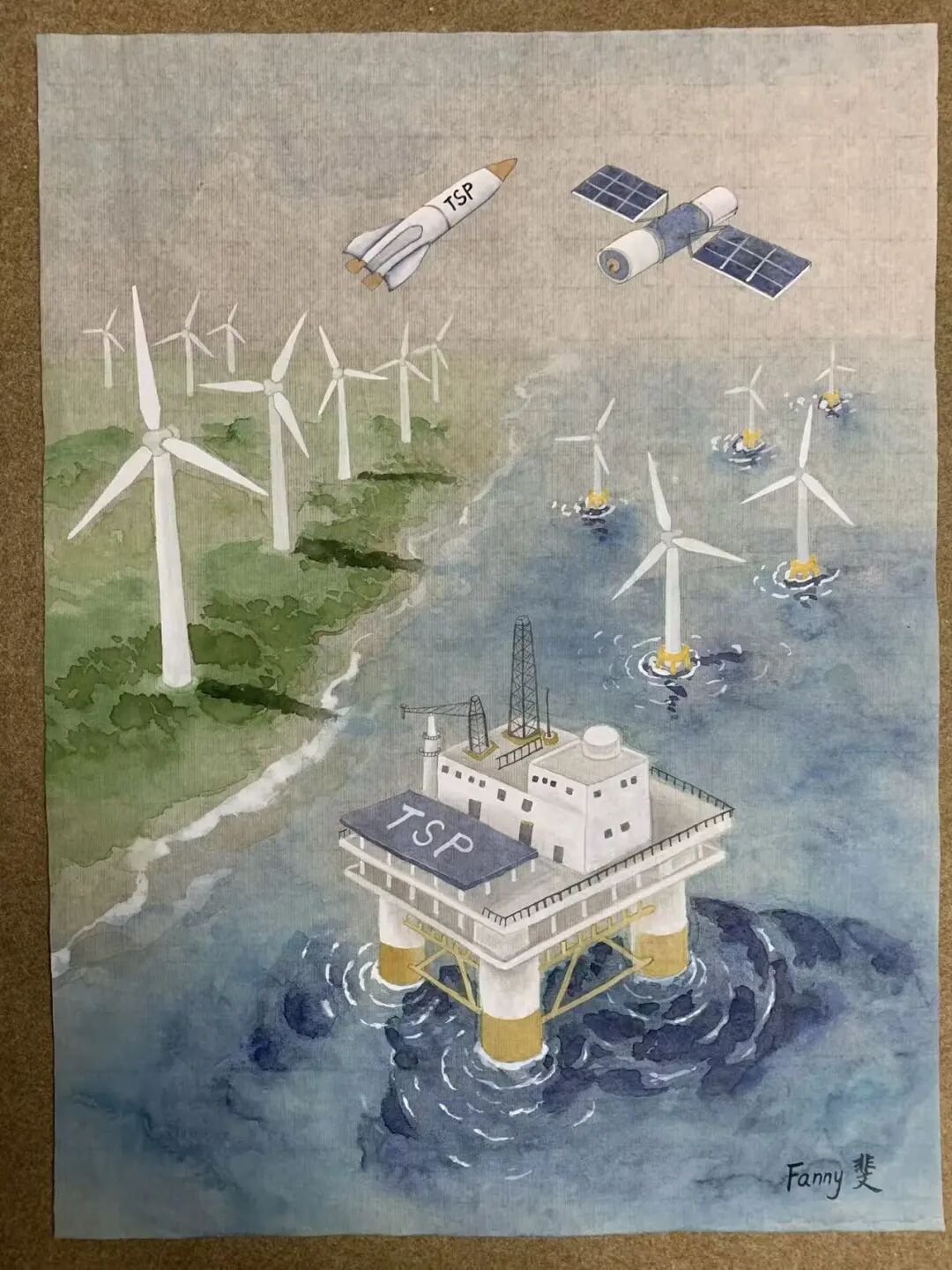作品以水墨诗意诠释硬核制造,将TSP海陆风电场与商业航天绘入同一时空,勾勒泰胜风能二十五载从海陆深耕到苍穹探索的产业跃迁,绘就"精于风,臻于无限"的能源答卷。