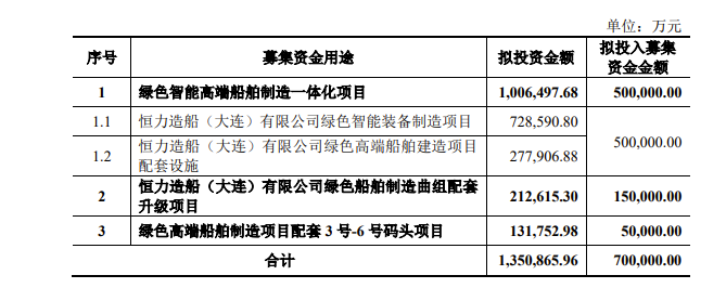 根据公告,此次定向增发募集资金总额不超过70亿元(含本数),扣除发行费用后的净额拟投资于三个项目,其中,绿色智能高端船舶制造一体化项目拟投入募集资金50亿元,恒力造船(大连)有限公司绿色船舶制造曲组配套升级项目拟投入募集资金15亿元,绿色高端船舶制造项目配套3号-6号码头项目拟投入募集资金5亿元。