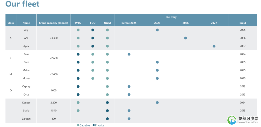 根据规划,该公司订购第二艘A级船“Wind Ace”号将于2026年交付,第三艘A级船“Wind Apex ”号计划于2027年交付。到2027年中期,Cadeler将运营一支由12艘船组成的船队,这将是全球载重能力最强、运输能力最优、服务范围最广的自升式安装船队,全面覆盖海上基础结构与风机的运输、安装及维护需求。