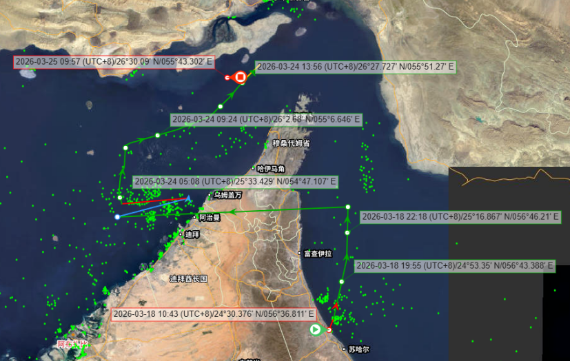 据了解,该船从阿曼出发后,正从阿联酋向巴基斯坦方向航行,3月24日凌晨4时53分从沙迦锚地出发,当日下午16时34分完成掉头折返。