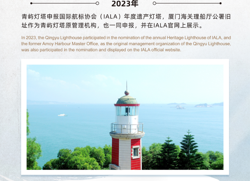 厦门海关理船厅公署经过保护性修缮历久弥新,作为航标人员培训、航标应急反应基地,也焕发着新生机。青屿灯塔和厦门海关理船厅公署之间的联系密不可分,2023年它们绑在一起向国际航标协会(目前的国际航标组织)申请年度遗产灯塔,把中国灯塔的风采向世界展示。