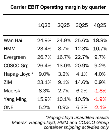 如果说全年数据反映的是行业总体盈利状态,那么季度利润率的变化则更清楚地揭示了市场压力正在迅速加大。根据Alphaliner统计,2025年第四季度,主要班轮公司的平均经营利润率已降至5.3%。