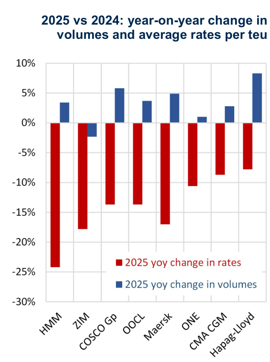 值得注意的是,2025年的集运业并不是典型意义上的需求不足或货量崩塌。恰恰相反,Alphaliner另一组对比图显示,2025年相较2024年,大多数主要班轮公司运量依然保持增长,只是增长的货量未能抵消价格下跌所带来的收入损失。