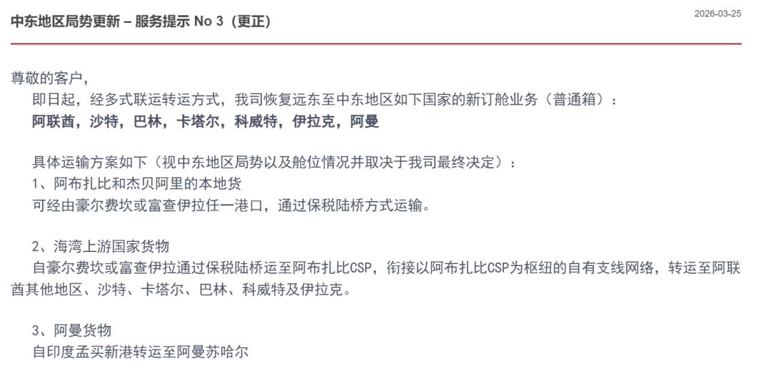3月25日晚,中远海运集运发布了更正后的中东地区服务提示,宣布即日起,经多式联运转运方式,恢复远东至阿联酋、沙特、巴林、卡塔尔、科威特、伊拉克、阿曼的新订舱业务(普通箱)。