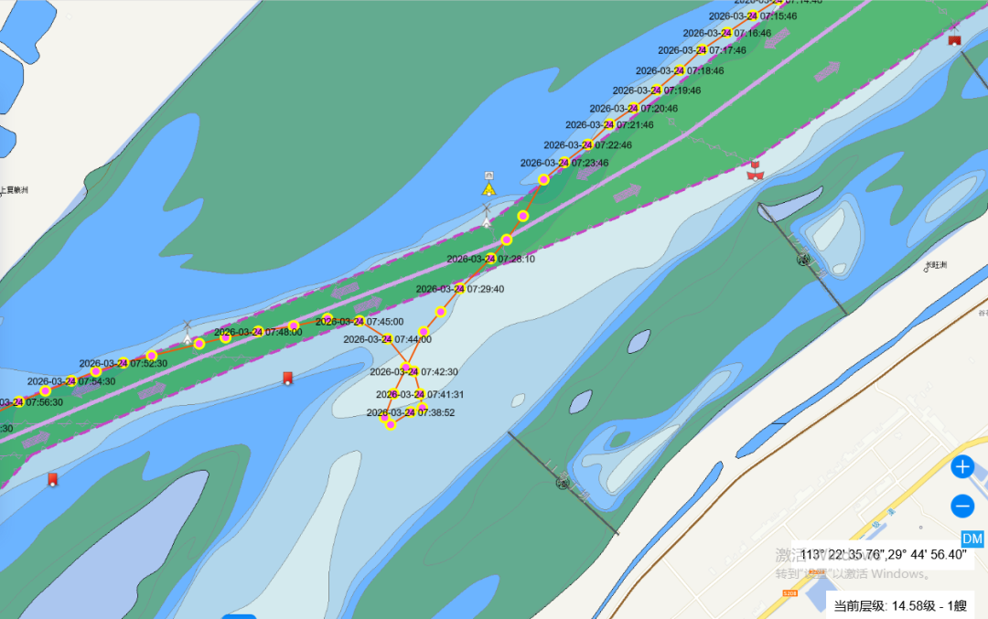 3月24日0730时,岳阳海事局指挥中心值班人员通过智管平台发现,界牌水域一上水船舶“豫信货XX”在航行过程中,逐渐偏离主航道,进入界牌水域南槽。值班员立即通过智管平台获取船长电话,点对点“叫应”提醒其调整航向,同时高频提示过往船舶保持安全距离。0743时,船舶回归主航道,险情得以解除。