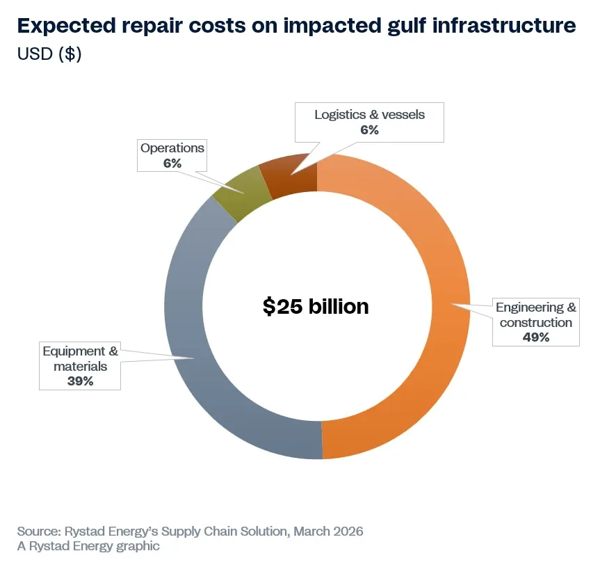 中东战事已引发全球油气供应严重中断。Rystad Energy基于对受损设施的初步评估预计,截至目前,相关能源基础设施的修复与重建费用至少将达250亿美元,且成本仍有进一步上行空间。支出主要集中在工程施工领域,其次为设备与材料采购。