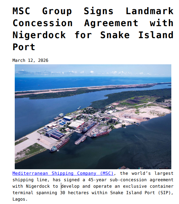 日前,MSC与尼日利亚海运与物流企业Nigerdock签署了一份为期45年的转特许经营协议(sub-concession agreement),将在拉各斯蛇岛港(SIP)开发并运营一座占地30公顷的集装箱码头。