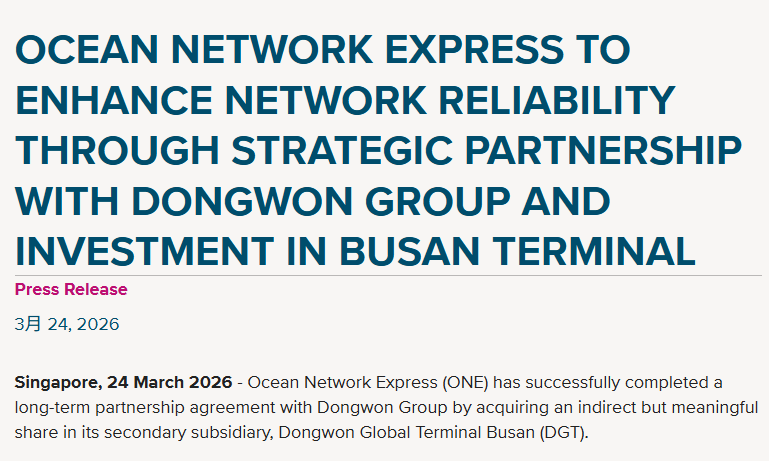此外,3月24日,ONE宣布与韩国最大渔业公司东远集团达成战略合作,同时投资釜山港码头,提升航线网络可靠性。