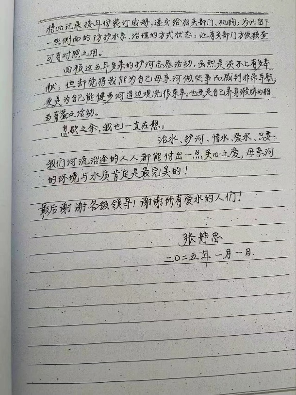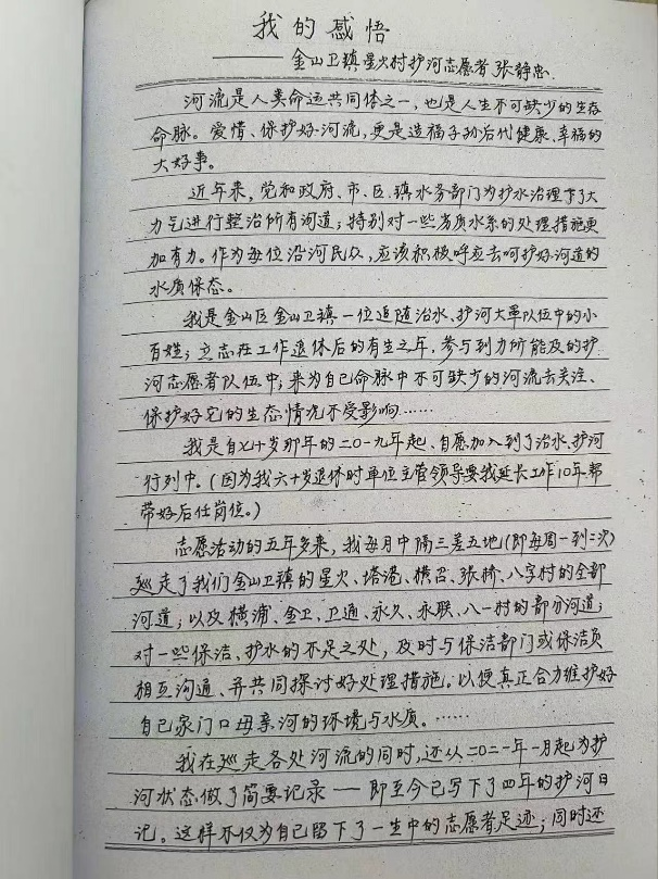 以“账”为据助力科学治水施策。他坚持每月全覆盖巡查、跟踪整改,手写的13本护河日记详细记录着巡河发现的问题,成为金山区河道治理的珍贵实践资料。他的先进事迹获上海电视台《新闻坊》专题报道,带动了一大批党员、青年、村民加入护河队伍,形成了“党员带头、群众参与、共治共享”的基层河湖保护新格局,用实际行动书写着一名基层共产党员的河湖守护情怀。