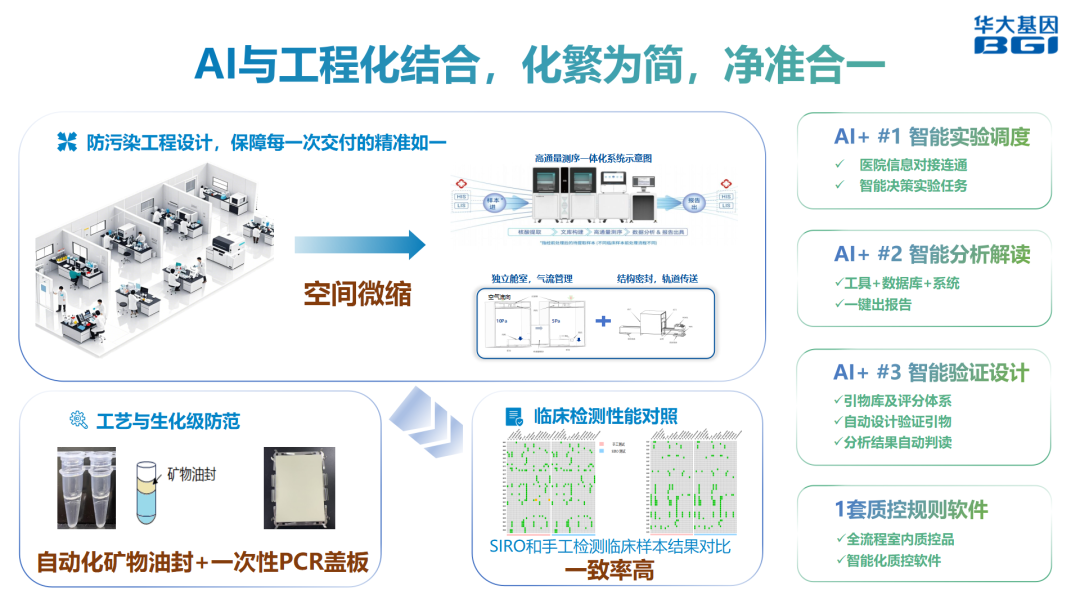 华大基因SIROmics整体解决方案整合湿实验硬件集成单元与干实验智能软件分析单元,通过智能决策引擎与自动化执行体系的深度耦合,实现从样本进入到报告生成的全链路自动化与智能化决策,降低人工经验依赖,提升检测流程的可控性与标准化水平。该方案也为医疗机构提供了一条从样本处理到报告生成的合规化、标准化路径,可有效降低院内高通量测序的技术准入门槛与运营复杂度,助力精准医疗检测的标准化普及与临床应用。
