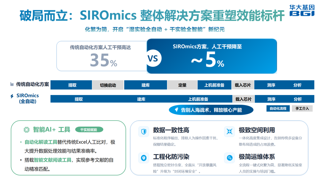 分步自动化方案需人工在提取、建库、定量及上机前处理等多节点介入,涉及提取、建库、定量、上机前准备、载入芯片、测序分析等多个环节,人工干预比例高达35%。SIROmics整体解决方案通过引入流程再造与智能决策系统,将人工干预比例降至5%左右,将人员从重复性劳动中释放出来,聚焦于质控复核与异常结果审核等高价值环节。