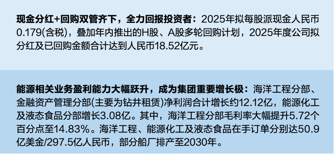 具体来看,清洁能源分部水上与陆上业务同步发力,在高压、低温等关键装备的市场持续获得领先份额,同时精准抓住天然气在水陆交通、发电等领域的应用增长机遇,同时积极开拓特种工业气体设备在高新科技产业的新兴增长空间。2025年,该分部新签订单达222.29亿元,保持增长,其中水上清洁能源相关业务截至2025年底在手订单超人民币190亿元,造船业务已排产至2028年。报告期内成功投产第二个焦炉气综合利用项目——凌钢一期项目、建成国内首个量产生物甲醇项目并实现投产;化工环境分部市场份额稳居首位,医疗设备部件业务、后市场服务业务保持稳健增长。截至2025年年末的在手订单同比增长36.27%至12.76亿元,为后期发展提供较好保障;液态食品分部盈利能力稳健,毛利率较同期提升至21.7%。
