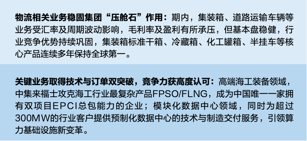 集装箱制造方面,期内,集装箱制造业务产销量主要受去年高基数效应影响同比有所回落,符合行业整体预期,但仍旧保持全球第一。其中干货集装箱累计销量222.49万TEU(去年同期:343.36万TEU),同比下降35.2%;冷藏箱累计销量20.82万TEU(去年同期:13.86万TEU),同比增长50.2%。期内,集装箱板块实现营业收入430.09亿元,净利润18.82亿元,毛利率略有下降至13.38%。