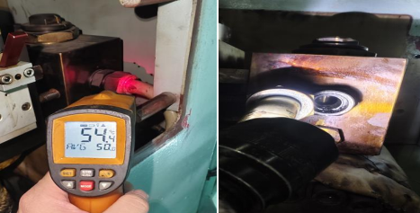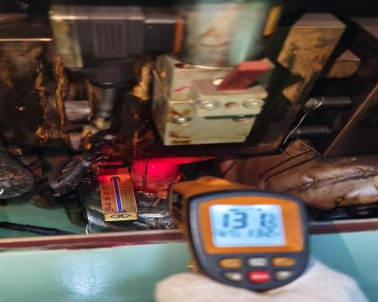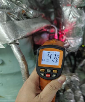 1、主机机带高压燃油泵出油阀和燃油上升管:通过手触摸和温度测量两台机带高压燃油泵出油阀和燃油上升管泄漏收集管的温度正常(图示四)