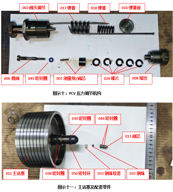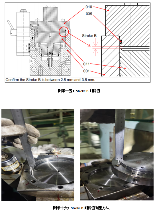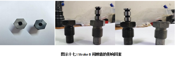 燃油压力控制阀PCV主活塞的平衡原理为:活塞上表面滑油压力×活塞上表面面积=活塞下表面滑油压力×活塞下表面面积+共轨燃油压力×阀芯与阀座接触横截面面积,而Stroke B的间隙值的大小将直接改变活塞上表面的滑油压力,该间隙值主要受到013阀芯和014阀座的影响,不同批次的产品在尺寸上有所不同,如图示十七。