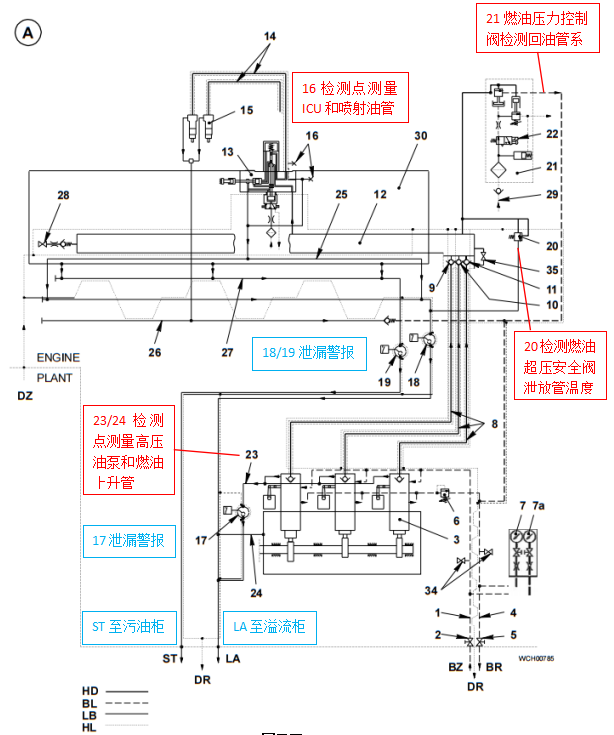 我轮主机型号为HMM-WIN GD 6RT-flex48T-D Tier ǁ,在某次离港作业时,主机按照驾驶台车钟指令可以完成正倒车启动,但在停车后主机燃油共轨压力下降很快,船舶顺利离港并定速航行后,我们发现WECS-9520控制系统中Actuator output输出值在同等转速/负荷下高出约5%(通过往期运行参数截图对比),结合离港作业时,主机燃油共轨压力在停车后下降很快的现象,初步判定主机燃油管系存在较严重泄漏,于是立即分段对燃油管系各部位点进行泄漏检查,燃油管系各泄漏部位点可通过说明书原理图查看(图示三)