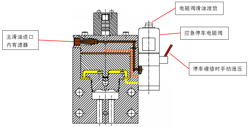应急停车保护功能(图示二):在应急情况下,柴油机保安系统发出信号(而非来自WECS-9520控制系统)给应急停车电磁阀,应急停车电磁阀将作用在主活塞上腔的滑油释放并将泄放阀打开,使共轨燃油压力迅速下降,保证主机可靠地停车。需要注意的是应急停车流程和正常停车有所区别,从主机安保系统发出的停车信号将会出现以下动作:1、安保系统触发泄油信号,通过应急停车电磁阀打开使燃油泄放到回油管。2、WECS-9520将机带高压燃油泵的执行机构拉回到“0”位,用来停止对燃油共轨供油。3、喷油控制将被 WECS-9520闭锁。此外还要注意应急停车电磁阀上的红色推杆可以将主活塞上腔的滑油释放以达到停车功能,但严格意义上讲,它并不属于应急停车方案,它主要是在停车维修时将共轨高压燃油手动泄压。