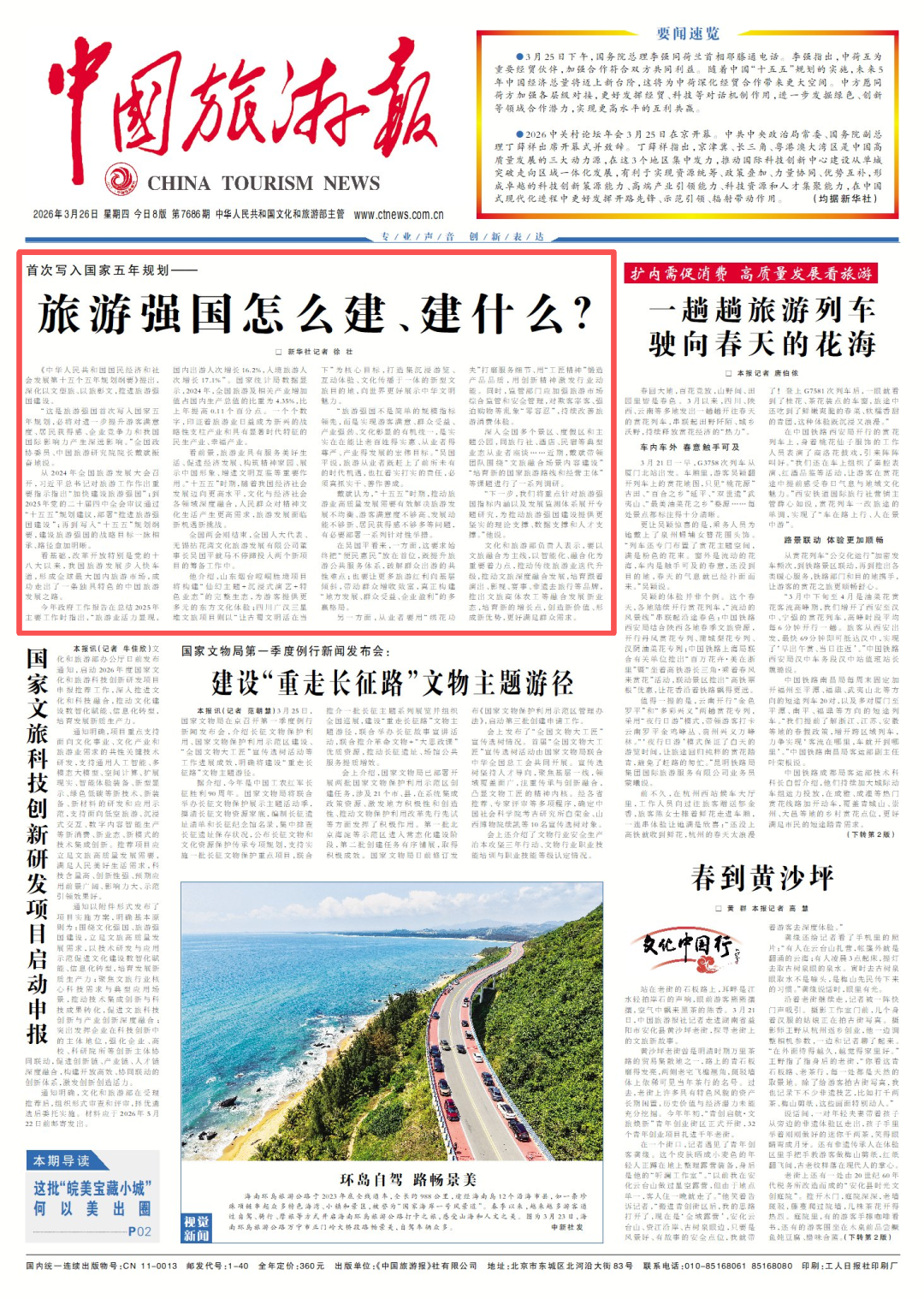 从2024年全国旅游发展大会召开,习近平总书记对旅游工作作出重要指示指出“加快建设旅游强国”;到2025年党的二十届四中全会审议通过“十五五”规划建议,部署“推进旅游强国建设”;再到写入“十五五”规划纲要,建设旅游强国的战略目标一脉相承、路径愈加明晰。