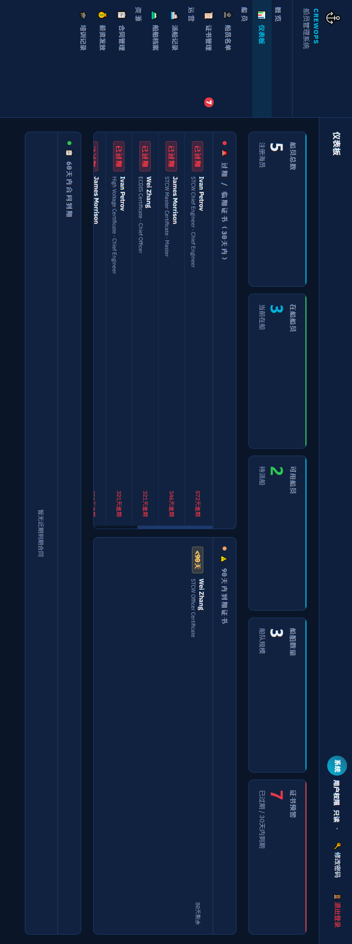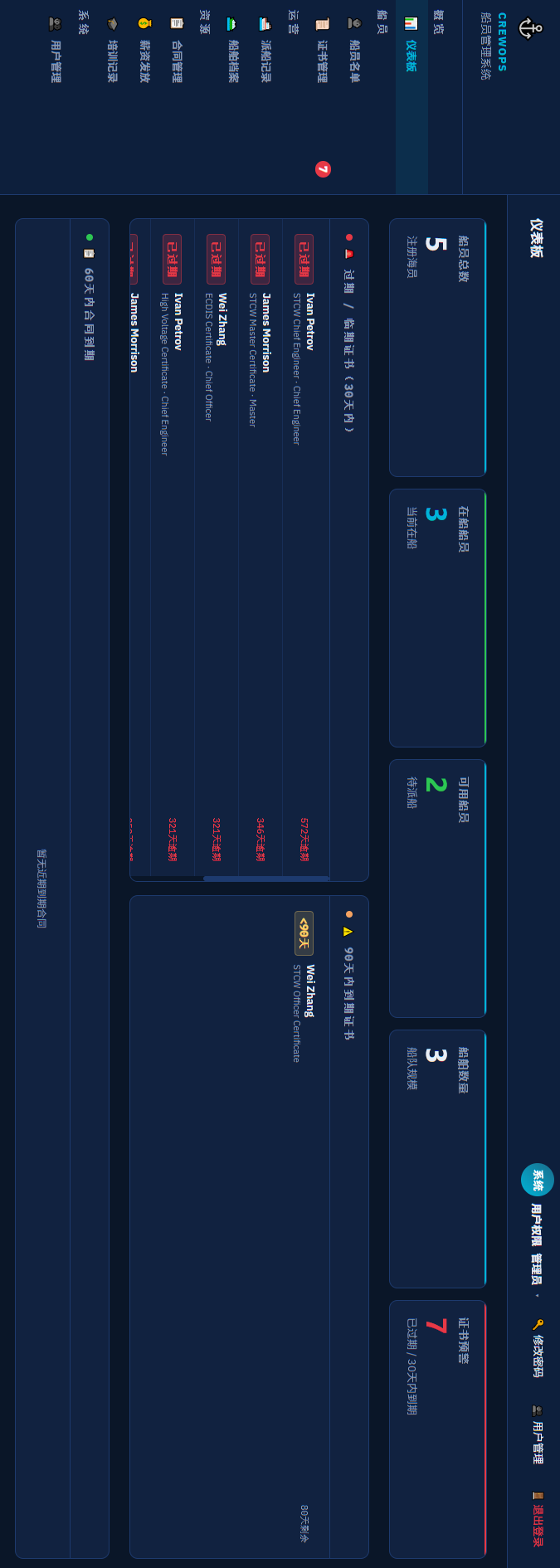 如果您是一家船员调派公司,主营业务是派船员,尤其是外派船员,就会面临很多日常管理的繁杂事儿:这个船员上了哪条船,签了几个月,合同什么时候到期,证书是不是有过期的,什么时候过期换证,现在是否在船,他一个月的工资是多少,不同合同里面的工资应该是多少,是否经过公司培训和证书培训,在哪里培训,什么时间培训的。。。如果调派公式规模不大,管理的船员不多,弄几个excel表格,雇几个小姑娘小伙儿,靠人工管理也倒是能管得过来。但是,如果船员数量较多,excel表格明显力不从心了,找一个船员的信息想找全了,就比较麻烦,如果公司领导要数据要的比较急,下面的小孩儿就焦头烂额,忙活了半天可能也完不成任务。况且,这里面还有一个大帐要算:找到原始数据,excel和人工很难对数据进行判断和统计,还需要人工去动手统计计算,这在商业运营中,就更加挠头了,一点也不从容。要想气定神闲地搞定船员调派等管理工作,就必须用成熟的软件系统,让计算机去做记录,分析,统计,判断,远远比人工好用的多了。为此,李老师利用几个月的时间,开发出一套较为通用的《船员管理系统CrewOps》,现把功能介绍一下:这个CrewOps系统,是服务器-浏览器模式的,也就是说,这个程序是运行在服务器上的,如果您想看看他的功能,就在您电脑浏览器地址栏上输入下面这个IP地址即可:这是真实的服务器公网地址,把这个地址敲上去之后,回车,浏览器就弹出了下面这个船员管理系统的登录页面:现在,您就可以打开浏览器,输入上面的IP地址,试试看!页面左上角有一个LOGO,如果您是一家公司,要使用这款程序,那就把这个LOGO改成您公司的LOGO,方便识别和宣传。因为是测试版本,展示一下功能用的,所以,设置了两套测试用户名和密码。之所以设置两套用户名密码,是因为admin是管理员权限,是最高权限,可以对船员的很多信息记录进行增删修改;而viewer是只读权限,只能看不能改。这样设计就是方便公司的日常管理,公司主管决定让谁拥有最高权限,谁拥有普通权限。为了让大家看清楚,我把截图立起来了,您看的时候把手机横过来即可。可以看到这个页面右上角清晰显示,用户权限是管理员。可以修改密码,用户管理,和退出登录。可以看到这个页面右上角清晰显示,用户权限是只读。可以修改密码和退出登录。少了用户管理这个功能,显然程序不让只读权限的人修改系统的权限,这个逻辑是对的。也就是说,不管用哪个用户名登录,主界面显示的内容基本上是一样的,就是使用的权限不一样。admin啥都能干,viewer只能看不能改不能删除不能编辑系统信息和船员管理信息。船员管理,在运营上工厂都是这么几大块,admin权限下是这样的:在页面左侧的侧边栏上,显示了系统的目录结构,非常简洁明了。用鼠标点击侧边栏上的一个条目,页面侧边栏的右侧就显示了对应的功能。很明显,这些船员的证书信息都出来了,显示了那些到期了,那些有效,而且页面顶上有搜索,方便人多了不好找;另外,页面右上角还有选择统计选项:这些都可以根据公司实际运营的需要,进行设计和修改。其他功能,也都类似,很好用,界面简洁美观,操作流畅,响应很快不卡顿。不管您是一个大公司的一个船员调派部门,还是一个船员管理公司,都值得拥有这么一套船员管理系统。一个是方便,用起来非常丝滑顺畅,不用雇佣很多人忙来忙去,为您节省大量的支出。如果您是一人公司,有市场资源,再用上这个系统,完全可以自己赚钱,把公司开起来,没有任何问题!一个是安全,数据都在服务器上,不在公司本地电脑上,当然您可以放在自己电脑上备份。即便是公司电脑损坏或者公司有人离职入职,都不影响公司船员数据的安全和使用。如果您有这个需要,随时找我,李老师为您的船员管理系统保驾护航!我可以为您搭建服务器,为您建立数据库,帮您做好服务器的日常管理。服务器就是您自己的,不是我的,所有的数据和权限都是您自己的,我只负责管理,并能够保障您数据的安全。船员调派业务中,船员的私人职业信息是一个宝贵且隐私程度很高的一个资源,需要在行业内做到高度保密,不能外泄,因为这是一个调派公司的命脉。我做这个系统还有一个闪光点,那就是我本人在行业里面工作数十年,自己也干过船员和一些调派业务,对服务器,计算机编程比较熟练,有较长时间的工作经验,对航海业务,船员调派业务,也比较熟悉。所以我做的这个系统,调派公司用起来就非常的顺畅丝滑,因为这个系统是航海+计算机两个技术的完美结合体。如果公司在哪些业务上有修改,升级,一个电话我马上就明白怎么回事了,不会产生外行无法理解不能尽快修改到位的尴尬局面。如果您对数据安全不放心,李老师可以到您办公室,直接帮你做好这一切后,还可以把你教会,然后你自己修改服务器的密码,我就进不去了,你自己管理就好。我只收取一定的软件费用和培训费用,其他的费用都是零,服务器是你的,数据是你的,数据安全你自己说了算。李老师召之即来,来之能战,战之能胜,胜利之后,挥之即去,不留一下一片云彩。微海事公众号