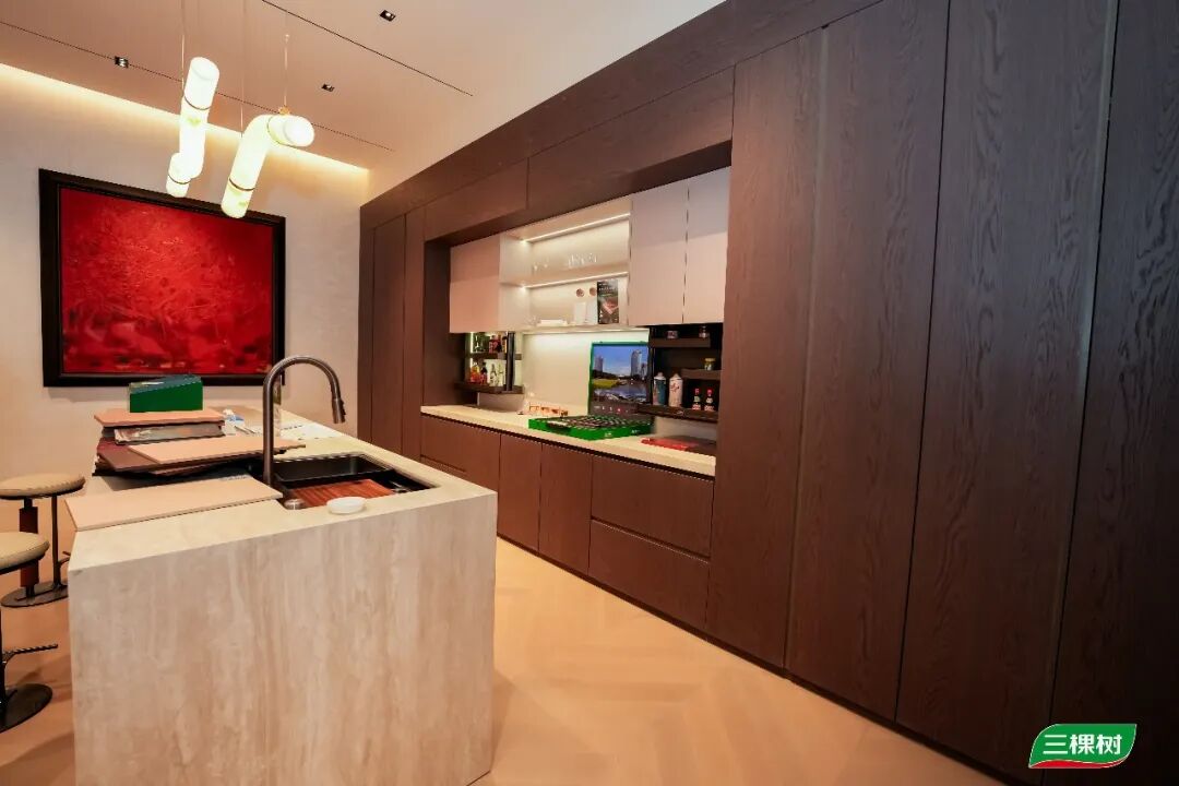 除呈现核心板材及工艺外,三棵树还推出覆盖基础装修到高端定制的全场景解决方案,将实木水漆大板、安芯漆面板等产品与客厅、厨房等家居空间深度融合,通过实景体验为“好房子”提供全链路健康板材支撑。