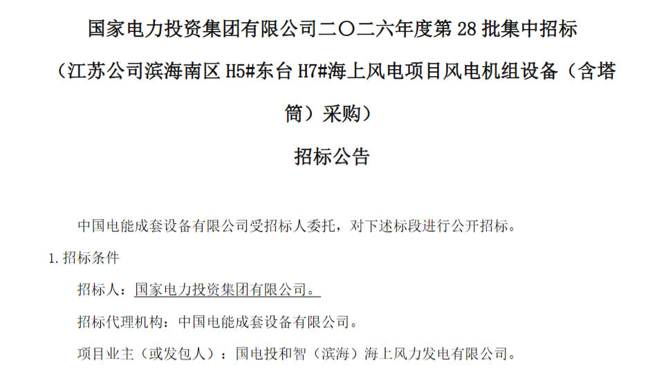 3月28日,国家电投电子商务平台发布《国家电力投资集团有限公司二〇二六年度第28批集中招标(江苏公司滨海南区H5#东台H7#海上风电项目风电机组设备(含塔筒)采购)招标公告》。