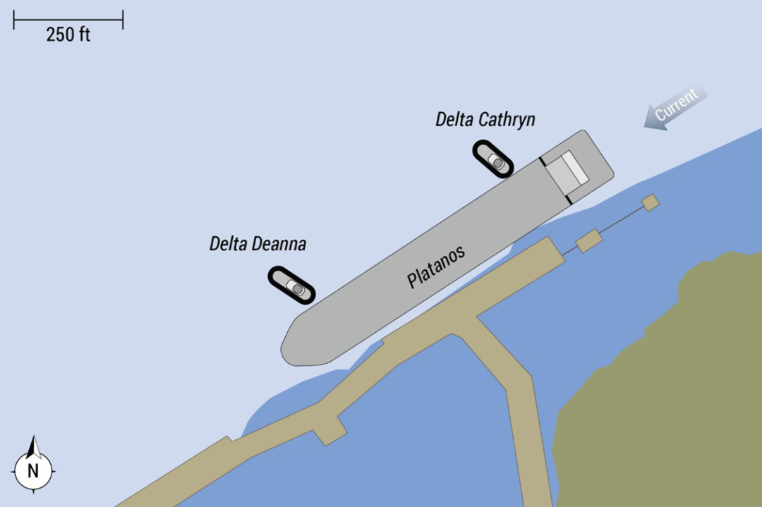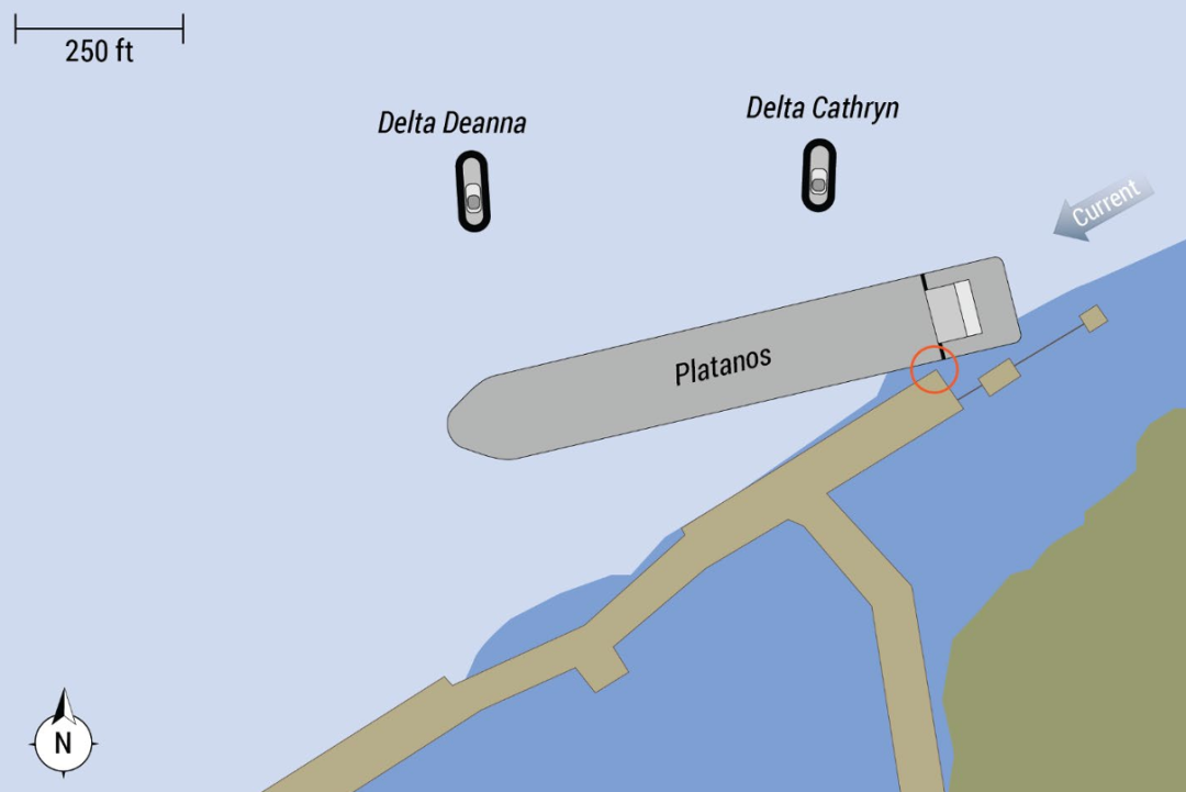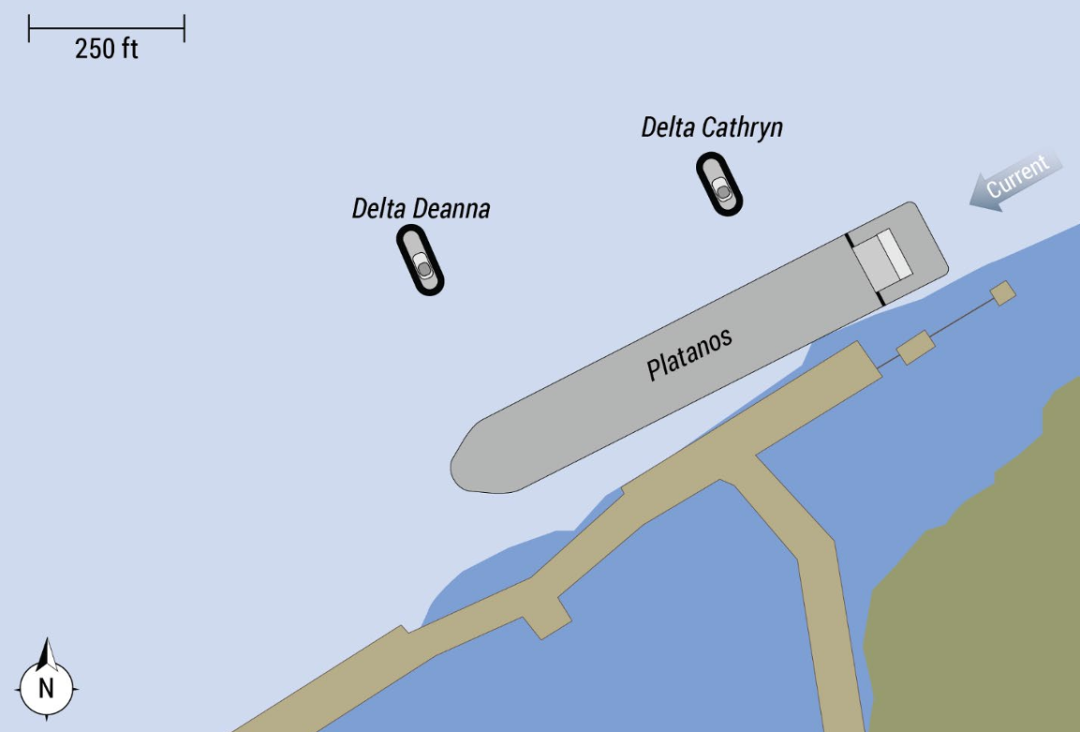 凌晨4点11分,引航员让"德尔塔·凯瑟琳"停住,然后问"德尔塔·迪安娜"的驾驶员,把船拖到和船身形成90度的角度。驾驶员回答"差不多了"。引航员说"你是在45度位置,应该在缆绳的前方"。就在这时,船长告诉引航员"船尾离码头太近了"。引航员立刻下令主机停车。