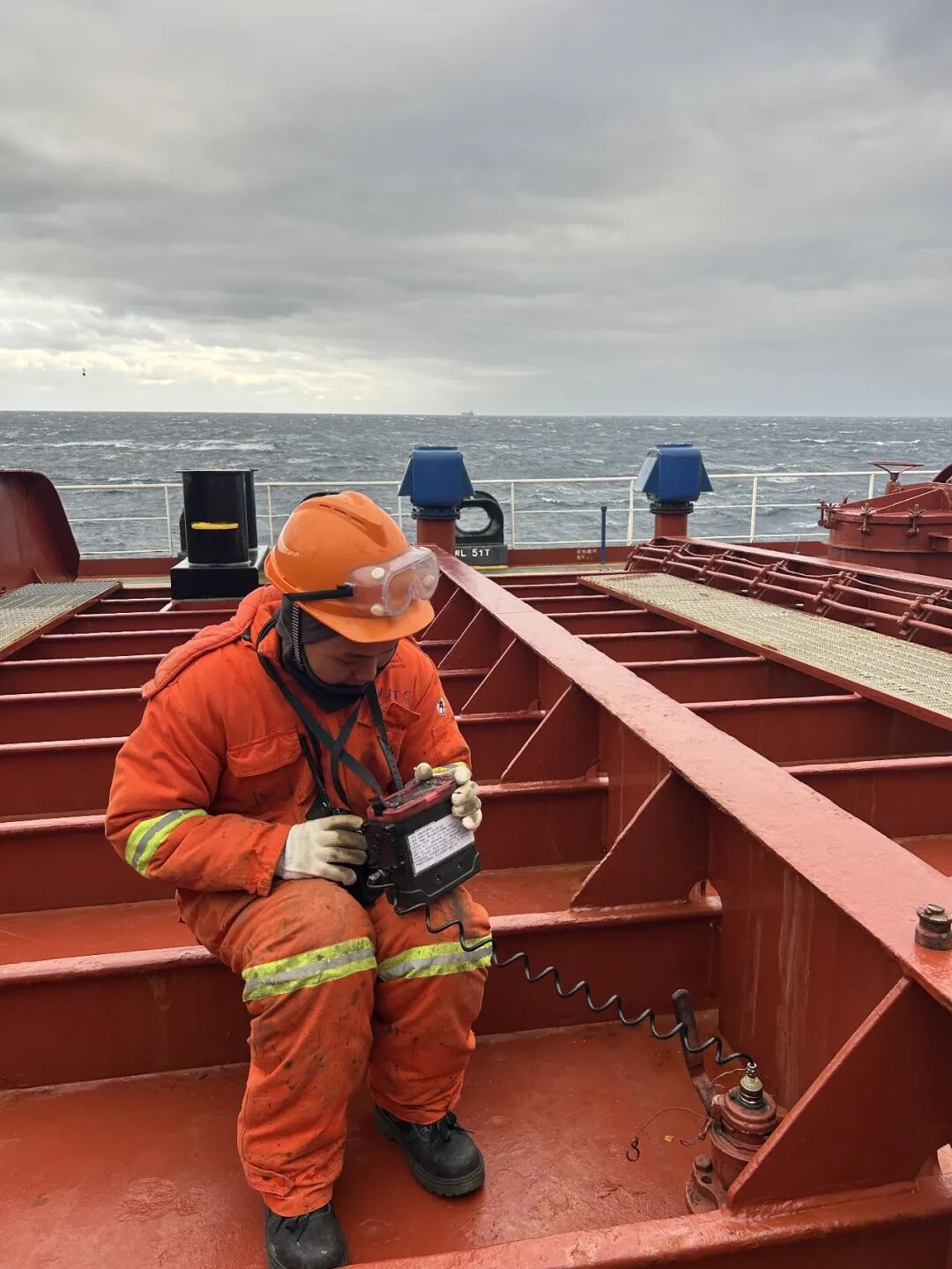 此时,韩国东南海域发布大风天气预警。午饭过后,风力骤然增强,冰冷的雨滴倾盆而下,风浪裹挟着雨珠砸在船员脸上,但该轮船员无人退缩,坚守岗位、稳步推进,以实际行动诠释航海人的担当。