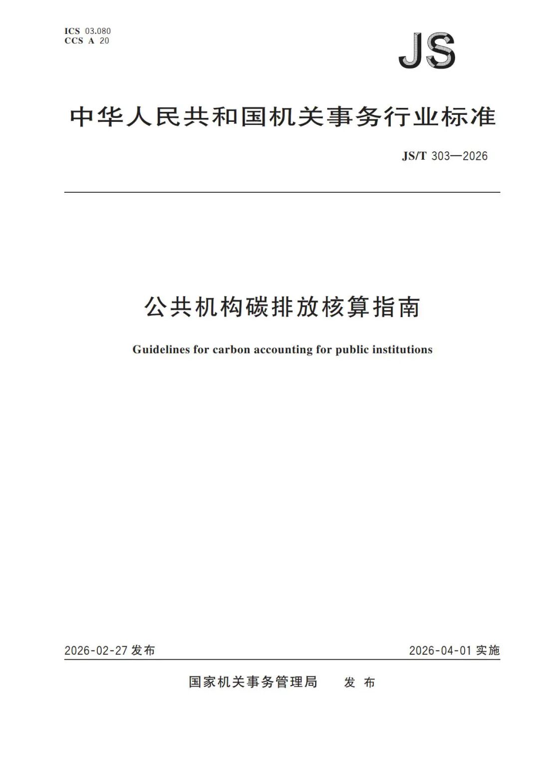 现发布机关事务行业标准《公共机构碳排放核算指南》,编号为JS/T 303-2026,自2026年4月1日起实施。