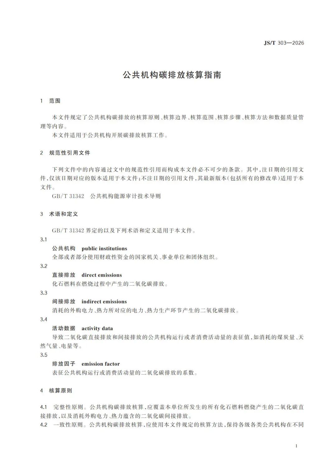 4月1日起实施!国管局发布行业标准《公共机构碳排放核算指南》(JS/T 303-2026)
