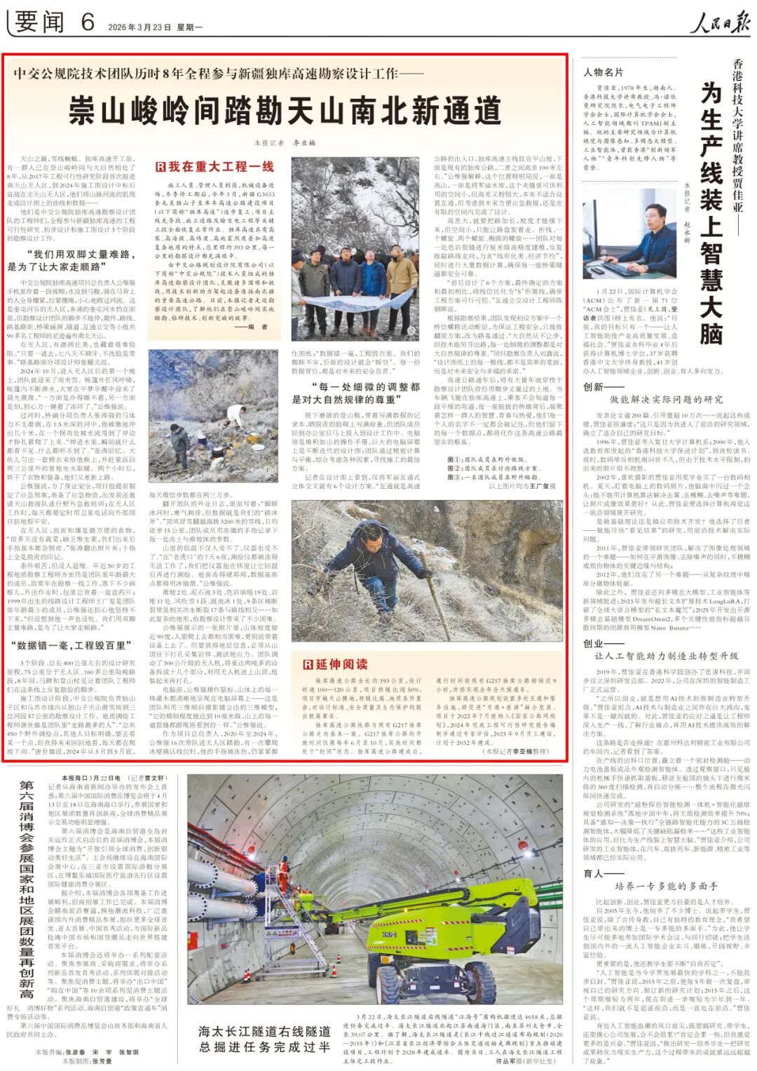 3月23日,《人民日报》刊发了题为《崇山峻岭间踏勘天山南北新通道》的报道,全篇讲述了公规院技术团队历时8年,在崇山峻岭间打造全天候贯通天山南北新通道的动人故事。现将文章转载如下:
