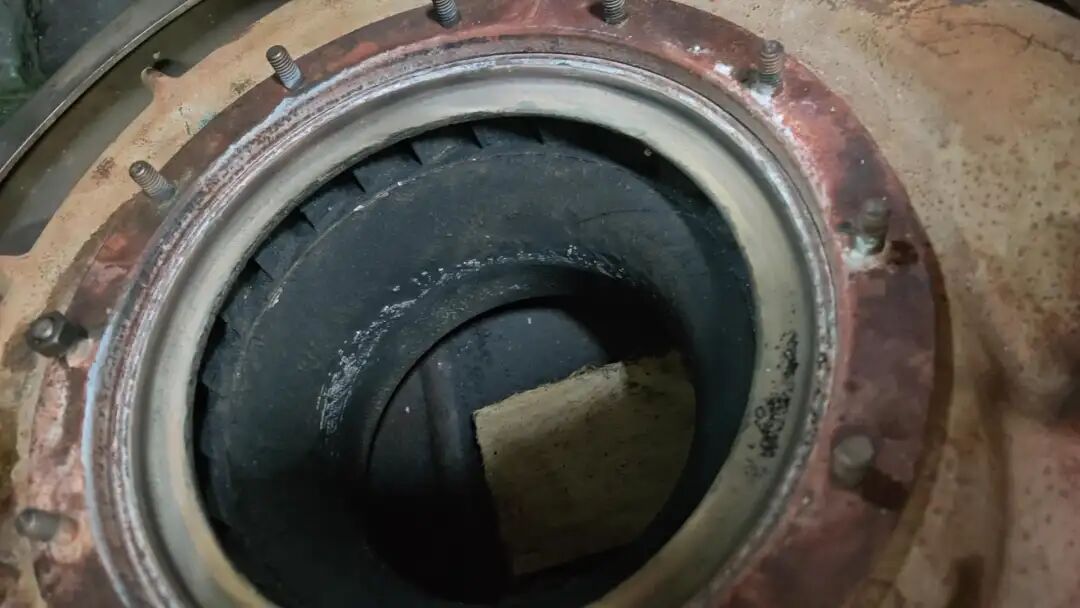 2.增压器保养及装配验证:因无增压器备件,且公司告诉该增压器于2024年4月送岸保养、不良件已换新(实际仅运行两年),现场仅对废气叶轮进行打磨,清除积碳至原有金属色,同时清洁喷嘴环积碳。由于缺少设备说明书,未进行轴向、径向间隙测量,手动转动压气侧时,发现叶轮存在轻微跑圆现象,且盘车手感不顺畅,初步判断叶轮存在轻微变形或磨损。