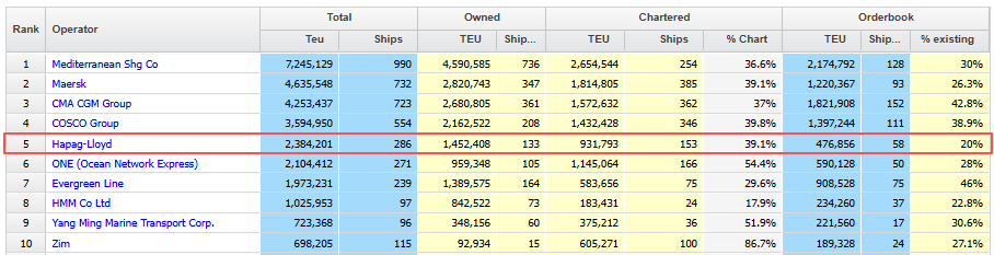 Alphaliner最新数据显示,赫伯罗特位列全球班轮公司百强第5名,船队规模286艘集装箱船,总运力为238.42万TEU,包括133艘自有船舶和153艘租入船舶。