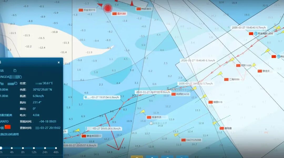 3月27日19时53分,夜色笼罩长江水域,安庆海事交管中心值班人员依托视频智能化平台,监测到马当整治#2危险水域,一艘名为“兴达**”的船舶出现异常:航向飘忽不稳,船位持续向黄浮外侧偏移,一步步逼近浅滩,搁浅风险一触即发!