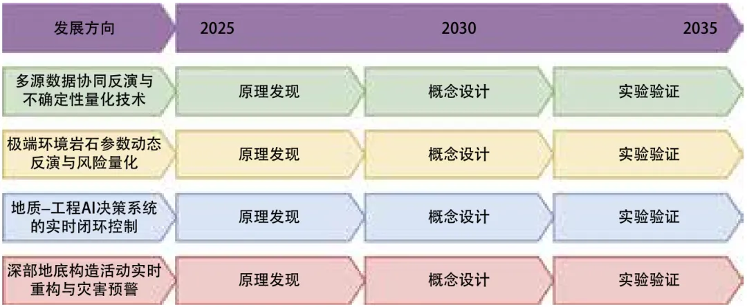 未来10年,该前沿将聚焦构建深地深海工程全生命周期智能风险防控体系,重点突破多源地球物理数据协同反演与不确定性量化技术,实现极端环境下地质参数的动态精准感知;推动AI驱动的地质−工程耦合决策模型从静态评估向实时动态预测—控制闭环升级,形成“感知—分析—决策—治理”一体化智能管控范式;加速技术成果向行业标准和产业化平台转化,建立覆盖全球深海油气田、海底隧道、深地实验室及地热开发等重大工程的灾害预警网络。