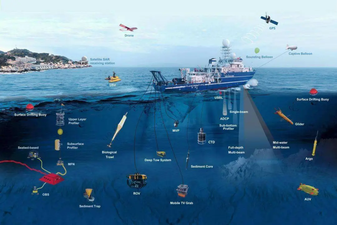 设备主要分为两类:一类搭载于水下移动平台,对深海海底进行精细测量;另一类搭载于空中平台,对浅水区域海底地形进行精细测量。