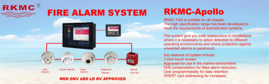 RKMC船舶火灾报警系统:和国际知名火警探头HONEYWELL 和 APOLLO 合作,集成了先进的探测技术与智能报警逻辑,覆盖机舱、货舱、控制站等所有关键区域。系统通过MED DNV、ABS、BV、LR、CCS, RINA KR等全球主流船级社认证,能够快速、准确地识别火情,并联动消防系统,最大限度降低火灾损失。集合HONEYWELL APOLLO 的全球业绩有上千条,RKMC国内主要业绩有扬州金陵船厂法国SOGESTRAN 4300DWT欧盟旗化学品船,欧洲知名船东BOSKALIS WESTMINSTER SHIPPING B.V 海工等等。