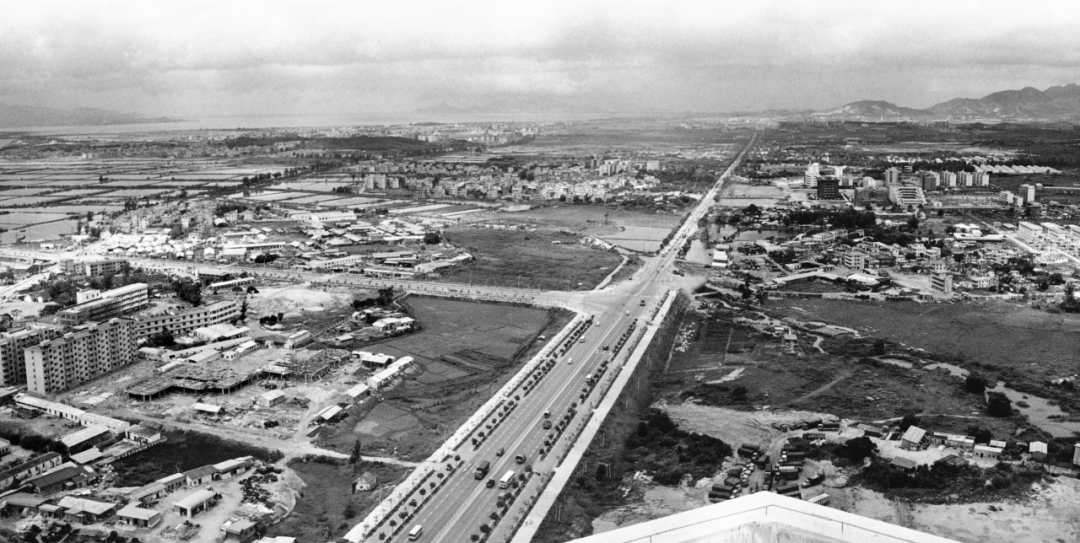 1987 年,福田中心区原貌,图中左为福田村、岗厦村,右为中心公园、田面村。(图源:《深圳市地名志》,2020年)