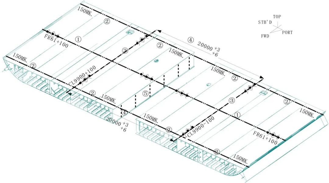 本次进行总组的两个分段位于船体双层底区域,承担着整船重量与外部海水压力,也是布置压载水舱、燃油舱等关键舱室的核心区域,其建造精度直接关乎船舶的稳性、强度及运营安全。