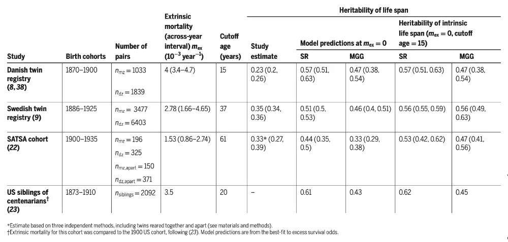 本表通过对不同双胞胎与兄弟姐妹队列的数据对账,展示了在剔除外源性死亡干扰后,人类内在寿命的遗传率从约 20%-35% 的传统估值翻倍提升至了 55% 左右。