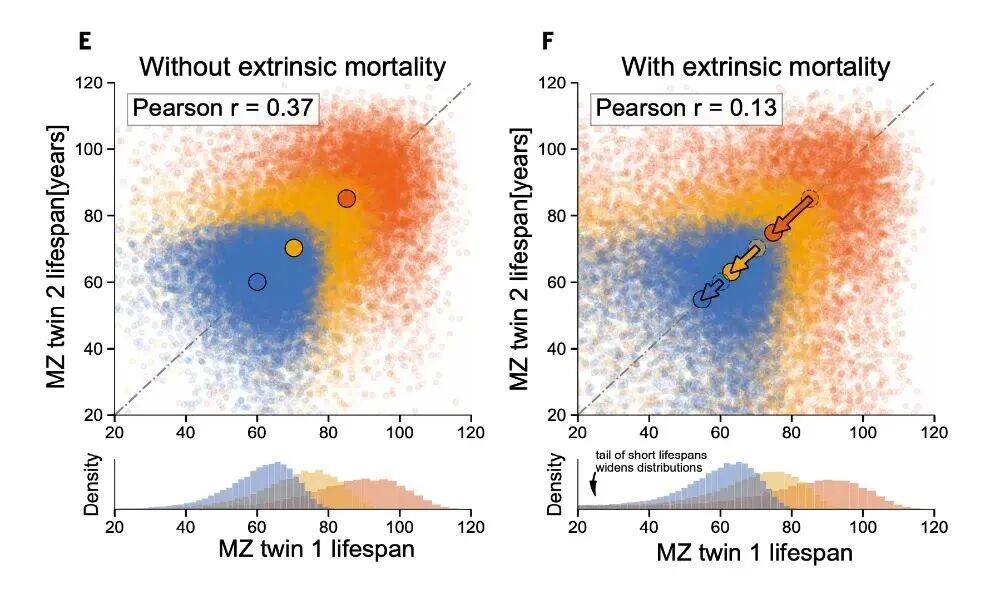 在剔除意外因素的理想状态下(图 E),同卵双胞胎寿命相关性高达 0.37;而一旦加入历史水平的意外噪音(图 F),相关性便因随机早逝形成的“数据长尾”干扰而骤降至 0.13。