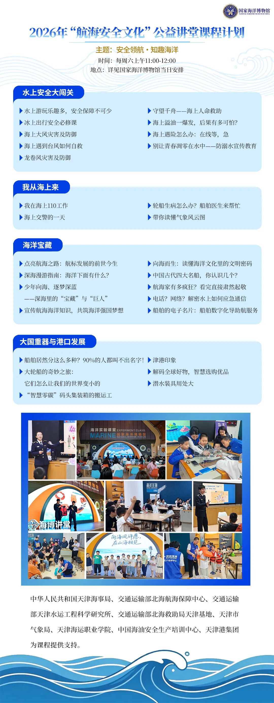 在第31个全国中小学生安全教育日来临之际,天津海事局、国家海洋博物馆联合多家单位举办“安全领航·知趣海洋——2026年航海安全文化公益讲堂课程计划”发布活动,旨在凝聚社会力量,通过固定阵地建设深入普及航海安全知识,弘扬海洋文化,提升社会公众特别是青少年的水上安全意识与海洋素养,助力加快建设海洋强国。