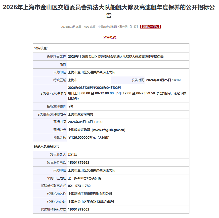 2026年上海市金山区交通委员会执法大队船艇大修及高速艇年度保养