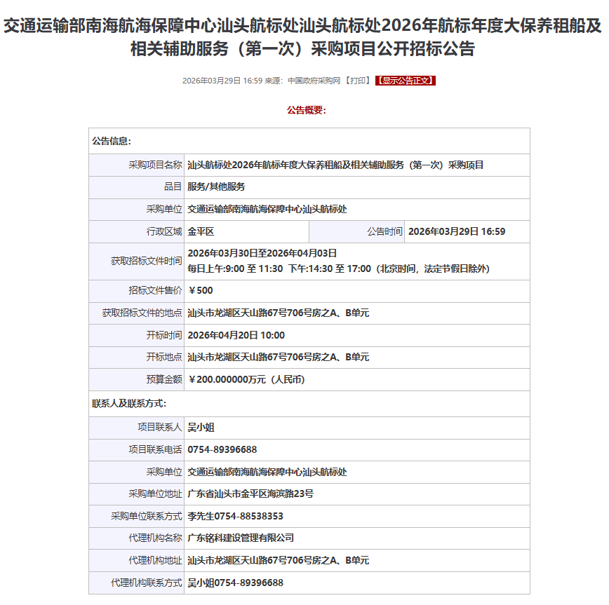 汕头航标处2026年航标年度大保养租船及相关辅助服务(第一次)采购项目