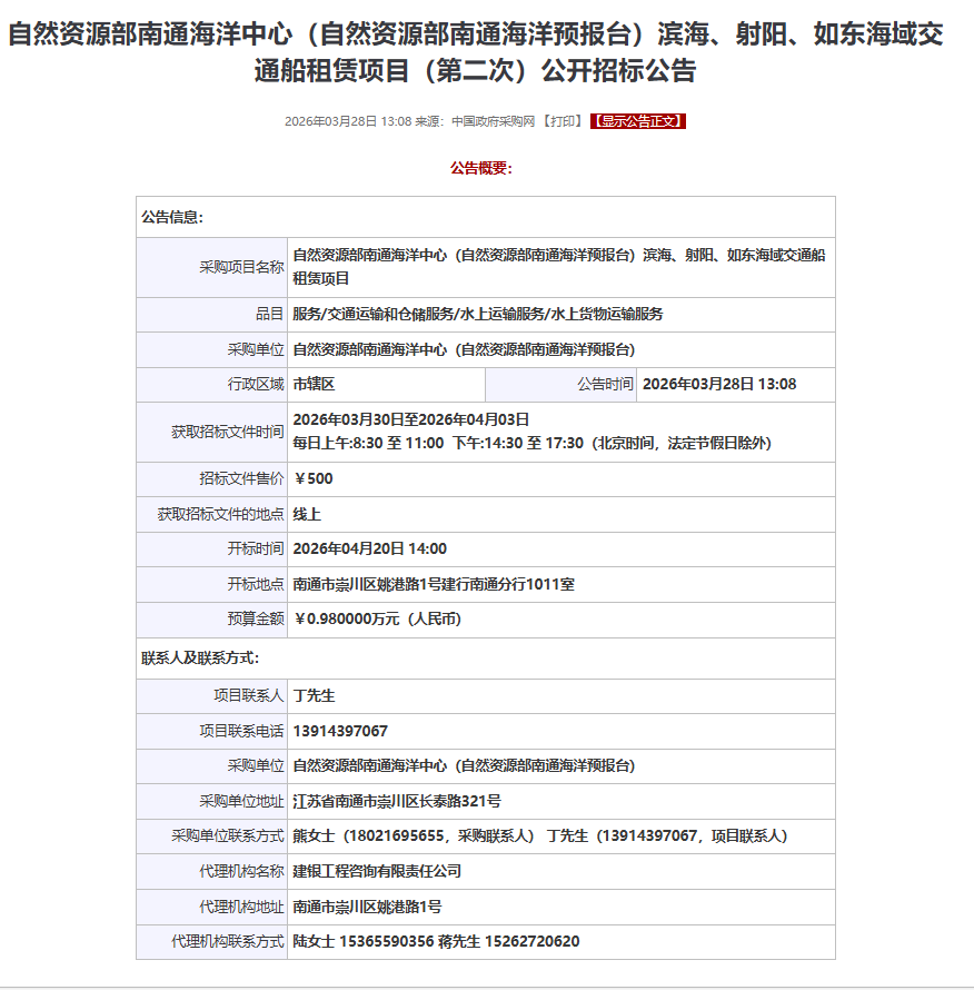 自然资源部南通海洋中心(自然资源部南通海洋预报台)滨海、射阳、如东海域交通船租赁项目