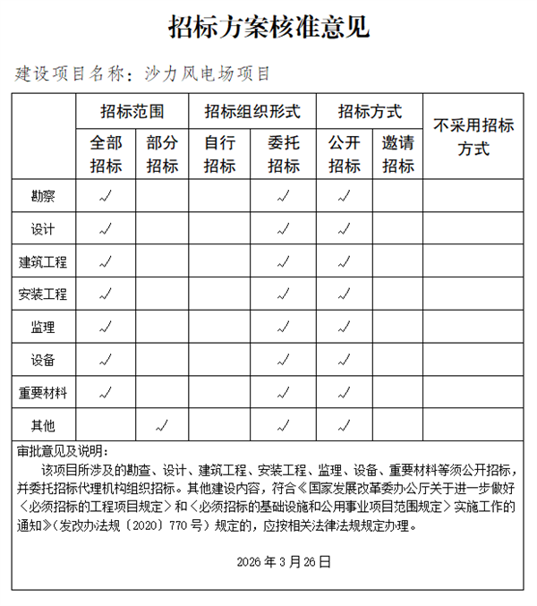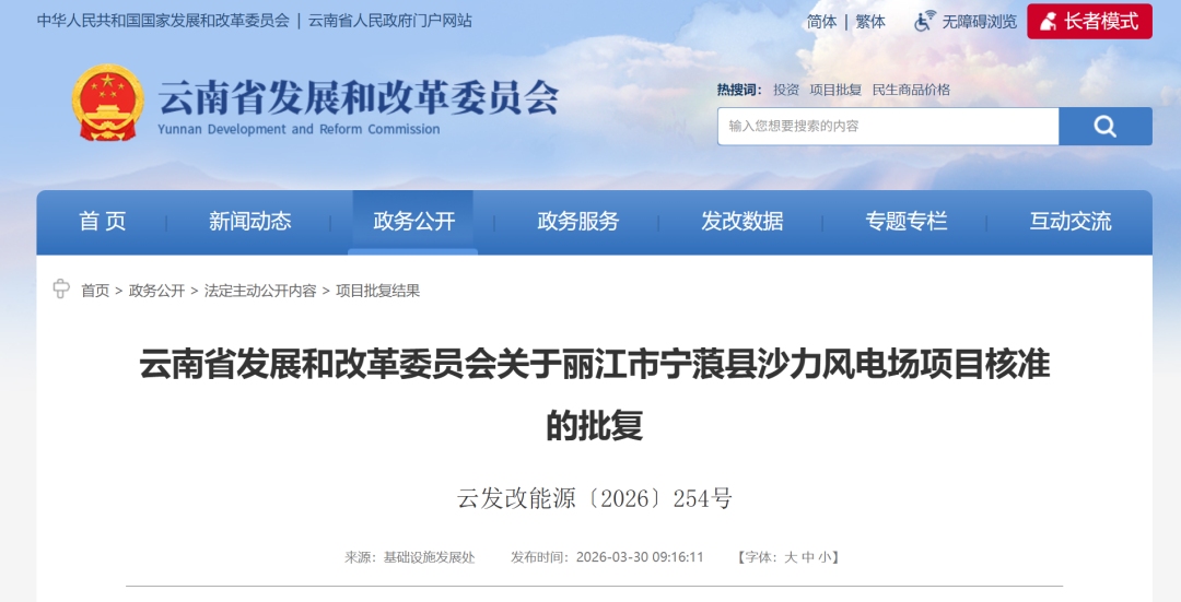 《丽江市发展和改革委员会关于上报沙力风电场核准的请示》(丽发改请〔2026〕20号)和有关材料收悉。经研究,现就该项目核准事项批复如下: